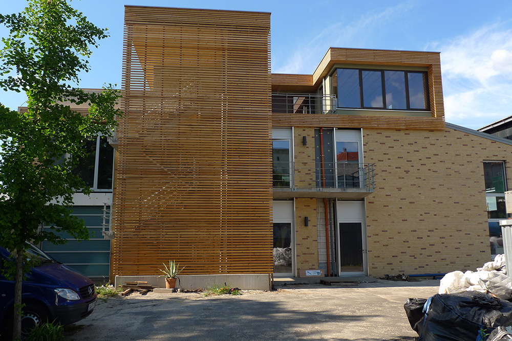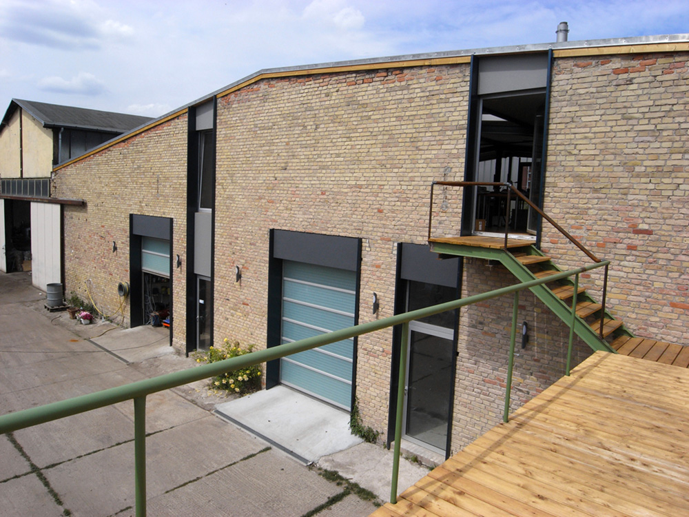 Sanierung des alten Ziegelmauerwerks. Neugestaltung der Südfassade durch die Herstellung neuer Fassadenöffnungen für großformatige Werkstatttore (transluzente Hubumlenktore) und für die neuen Zugänge. Neubau einer Sonnenterrasse mit Carports im Hof.